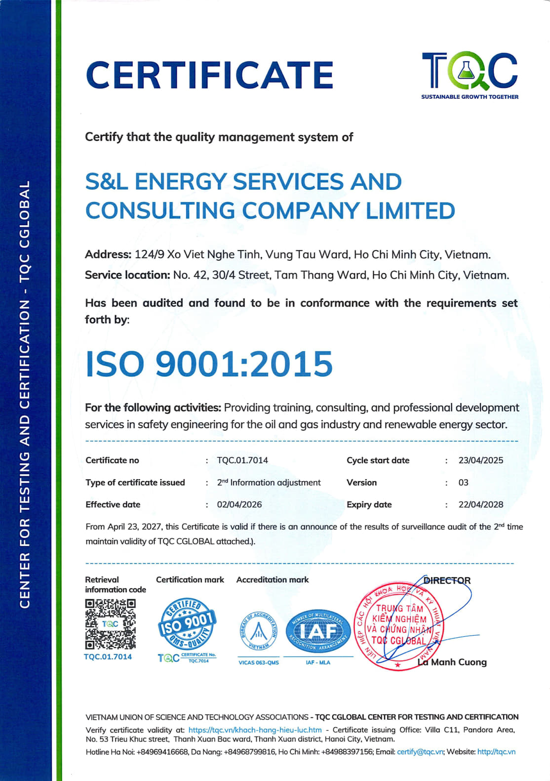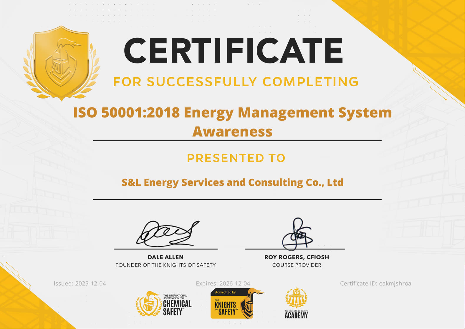 S&L ENERGY: Đạt chứng nhận đào tạo Nhận Thức Quản Lý Năng Lượng Chuẩn Quốc Tế ISO 50001:2018